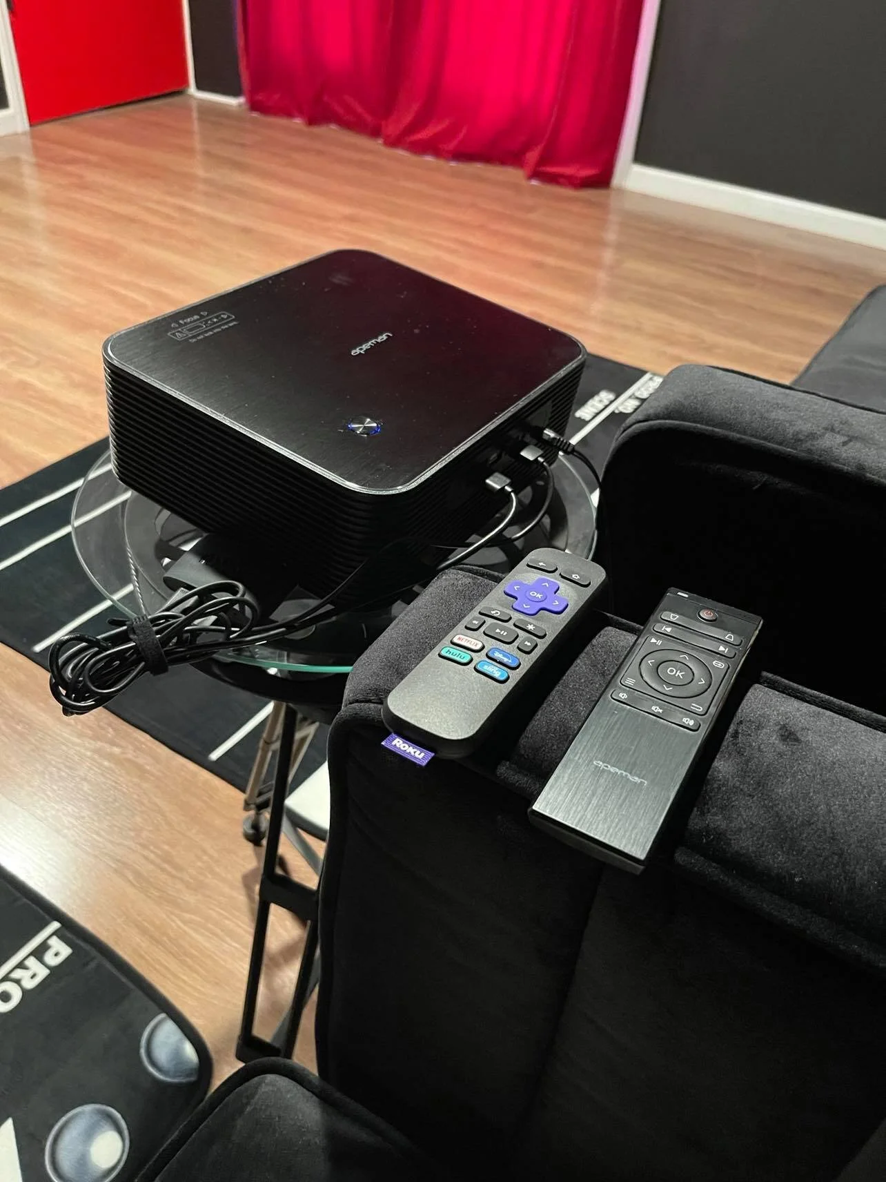 The red arrow is pointing at the Roku as well as the Roku controller. Once the projector is turned on, the Roku will automatically turn on since it is powered by the projector.